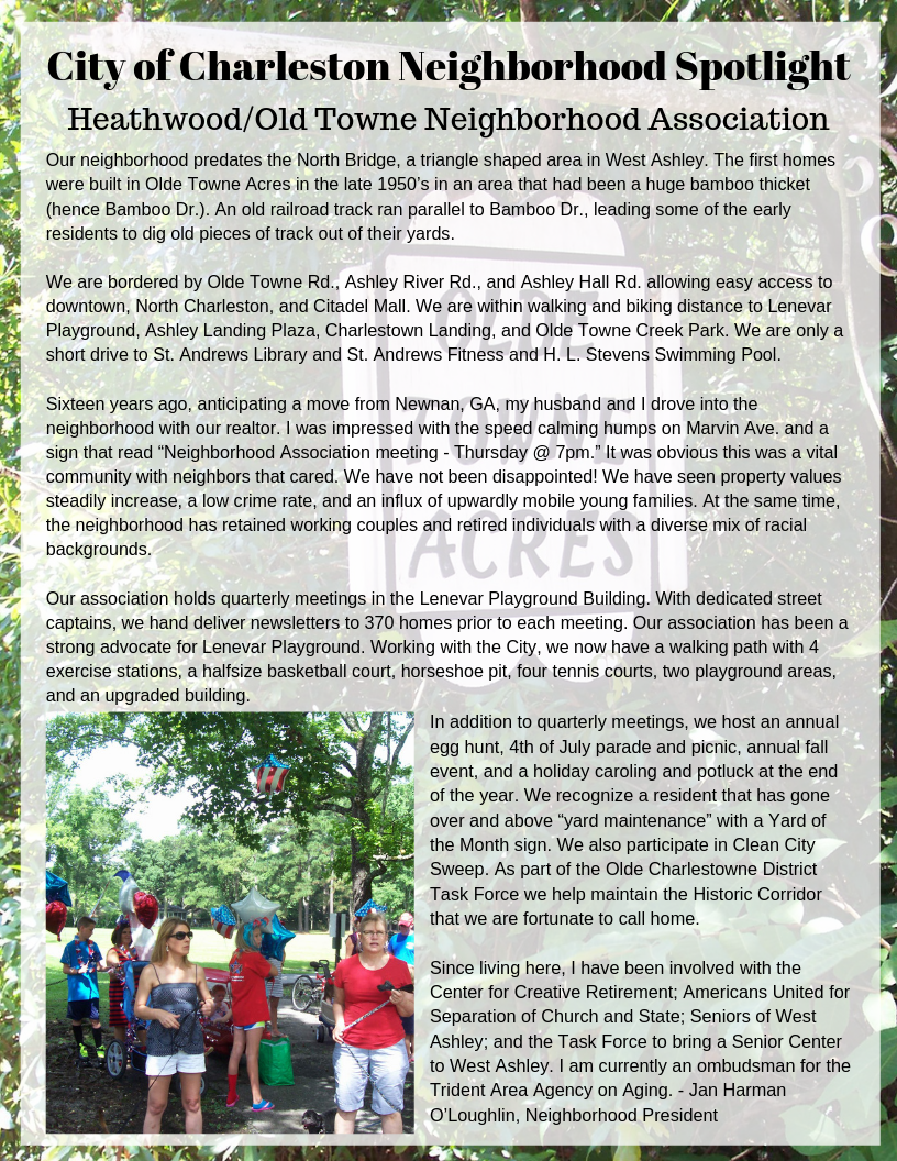 In 2019 Neighborhood Services began highlighting the accomplishments that committed neighborhood association presidents and their fellow association members have achieved across Charleston. We are interested in a holistic view of neighborhoods and association efforts over time. We include things like neighborhood advocacy for safety, beautification, traffic, development, fundraising/social gatherings, neighbors helping neighbors, etc. For past spotlights, click here!